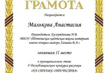 Малькову А., занявшую II место в муниципальном этапе V Республиканского конкурса рисунков «НА СТРАЖЕ ОТЕЧЕСТВА» (руководитель Хуснутдинова Н.В.).