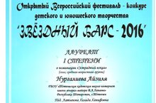 В городе Казани прошел Открытый Всероссийский фестиваль-конкурс детского и юношеского творчества «Звездный барс – 2016», вдохновителем которого является народный артист России Бедрос Киркоров. Со всех уголков России прибыли дети на этот фестиваль. Воспитанница 6 класса ГБОУ «Тетюшская кадетская школа-интернат» Нургалиева А. стала лауреатом I степени. Поздравляем и желаем творческих успехов!