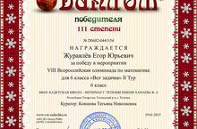 Журавлев Егор, кадет 6 класса ГБОУ "Тетюшская кадетская школа-интернат", стал победителем VIII Всероссийской олимпиады по русскому языку (награжден Дипломом II степени, руководитель - Фролагина О.Н.) и победителем VIII Всероссийской олимпиады по математике (награжден Дипломом III степени, руководитель – Ковшова Т.Н.).