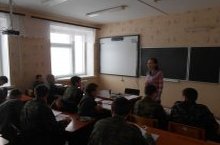 В рамках проведения месячника военно-патриотического воспитания и спортивно-оздоровительной работы и в целях профориентации в ГБОУ "Тетюшская кадетская школа-интернат" 28 января 2015 года состоялась встреча начальника отдела военного комиссариата РТ по Тетюшскому району Гарифуллина Ф.А. и курсанта Московского высшего военного командного Краснознаменного училища Нагуськина А. с воспитанниками 10-11 классов Кадетской школы-интерната. В ходе профориентационной беседы кадеты получили информацию о порядке поступления и обучения в высших военных учебных заведениях.