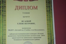 На базе МБДОУ «Детский сад «Березка» города Тетюши» прошел конкурс «Лучший воспитатель малокомплектного детского сада – 2019». Жюри отметило высокий уровень подготовки педагогов. Наш воспитатель Исаева Е.П. заняла первое место. Поздравляем. Конкурс стал для всех хорошей профессиональной школой.