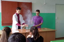 Учащиеся 8 класса Романов Андрей и Казаев Алексей под руководством Кильганова Д.П., учителя химии показали интересные фокусы с химическими веществами учащимся 1-9 классов