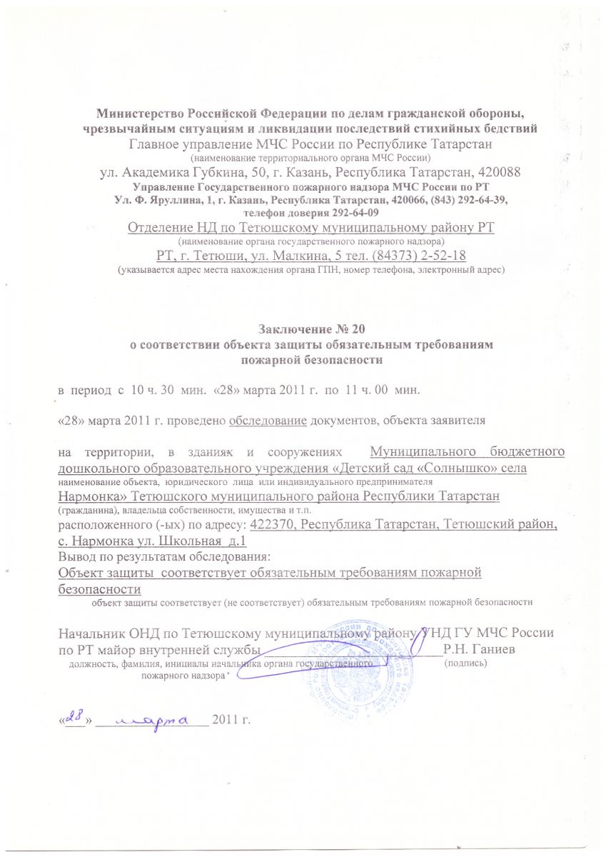 Заключение о соответствии объекта защиты требованиям пожарной безопасности