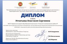 Подведены итоги республиканского конкурса методических разработок советников директоров по воспитанию «Тәрбия. Воспитание», приуроченного к 200-летию со дня рождения выдающегося татарского литератора, ученого-этнографа и просветителя Каюма Насыри. По результатам конкурса советник директора по воспитанию МБОУ «Нармонская СОШ» Игнатьева А. С. награждена дипломом за 1 место в номинации «Лучшая практика работы детской (молодежной) общественной организации».