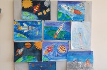 Ребята устроили выставку своих рисунков, посвященных космической теме.
