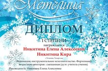 17 января были подведены итоги Всероссийского многожанрового конкурса-фестиваля детского, юношеского и взрослого творчества «Метелица», проводимый в городе Ульяновск. От Детской школы искусств в конкурсе приняла учащаяся 3 класса музыкального отделения Кира Никитина. В номинации «Инструментальное исполнительство» дуэт Никитиной Киры и преподавателя Никитиной Е.А. удостоен Диплома I степени. Преподаватель отмечена Благодарственным письмом за вклад в эстетическое воспитание подрастающего поколения и профессионализм при подготовке участников.