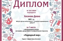 Учащаяся Детской школы искусств художественного отделения Хасанова Диана приняла участие в Международном конкурсе фотографии, декоративно-прикладного творчества и изобразительного искусства, проводимого для дошкольников, школьников и студентов. Цель конкурса: развитие и демонстрация творческих способностей, обмен опытом в области художественного и декоративно-прикладного творчества. По итогам конкурса в номинации «Подводный мир» учащаяся 3 класса ДШИ Хасанова Диана, удостоена Диплома за 1 место. Преподаватель керамики Гафаров Н.В. отмечен Сертификатом за подготовку победителя. Поздравляем!