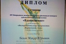 С 02 по 09 апреля 2020 в городе Чебоксары на базе БПОУ "Чувашское республиканское училище культуры (техникум)" Минкультуры Чувашии проводился XIV Открытый межрегиональный фестиваль-конкурс художественного творчества «Вдохновение», организованный Министерством культуры, по делам национальностей и архивного дела Чувашской Республики. В состав жюри конкурса вошли деятели культуры и искусства Чувашской Республики и Российской Федерации, ведущие специалисты разных жанров художественного творчества, педагоги творческих образовательных учреждений. От Детской школы искусств принял участие в конкурсе Белов Макар, обучающийся музыкального отделения. Программа состояла из двух разножанровых произведений. По итогам конкурса в номинации "Инструментальное творчество. Фортепиано. Соло" во второй возрастной категории Макар отмечен Дипломом за I место. Преподаватель Баландина Е.Ю. отмечена Благодарственным письмом оргкомитета за профессиональную подготовку участников конкурса, за достойный вклад в развитие инструментального творчества и в связи с 75-летием Чувашского Республиканского училища культуры. Поздравляем!