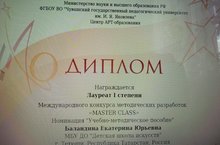 В апреле - мае ФГБОУ ВО «Чувашский государственный педагогический университет им.И.Я.Яковлева» и Центр АРТ – образования организовали и провели IV Международный конкурс методических разработок «MASTER CLASS". Конкурс проводился в следующих номинациях: "Разработка форм, методов, средств обучения и воспитания", "Учебно - методическое пособие", "Урок (учебное занятие)". В конкурсе приняли участие 95 работ со всей России и зарубежья: Приморский край, Саратовская область, Орловская область, Восточный Казахстан, Республика Татарстан, Ленинградская область, Свердловская область, Калужская область, Оренбургская область, ХМАО–Югра, Кировская область, Иркутская область, Челябинская область, Республика Башкортостан, Волгоградская область, Амурская область, Республика Чувашия, Томская область, Новосибирская область, Воронежская область, Псковская область, Краснодарский край, Архангельский край, Псковская область, Ямало-Ненецкий АО, Республика Мордовия, Украина, Нижегородская область, Самарская область, Липецкая область и т.д. Преподаватель музыкального отделения Детской школы искусств г.Тетюши Баландина Е.Ю. приняла участие в номинации "Учебно - методическое пособие" по дисциплине "Сольфеджио". По итогам конкурса преподаватель Детской школы искусств отмечена Дипломом Лауреата I степени. Поздравляем!