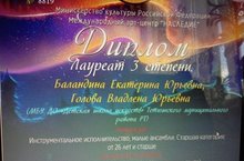 В мае завершил работу III Международный кастинг-конкурс искусства и творчества «Сияние-2020», организованный арт - центром "Наследие" г.Москва. В связи с эпидемией коронавируса Covid-19 арт-центр проводил конкурс дистанционно в номинациях: "Вокал", "Малые вокальные ансамбли", "Хоры", "Инструментальное исполнительство, соло", "Инструментальное исполнительство, малые ансамбли", "Инструментальное исполнительство, ансамбли и оркестры", "Хореография", "Художественное слово", "Театр", "Изобразительное искусство" и т.д. Жюри представляли заслуженные работники культуры, заслуженные артисты России, балетмейстеры, лауреаты международных фестивалей и конкурсов и др. От Детской школы искусств г.Тетюши принял участие инструментальный дуэт преподавателей Баландиной Е.Ю. и Головой В.Ю. В номинации "Инструментальное исполнительство, малые ансамбли" творческий дуэт стал Лауреатом III степени. Оргкомитет Международного кастинг-конкурса «Сияние-2020» выражает огромную признательность за участие в проекте и благодарит всех конкурсантов за труд, за упорство и профессионализм. "Желаем Вам в это нелегкое время не снижать заданной планки и уверенно идти вперед к вашим успехам и свершениям, не забывая при этом заботиться о своем здоровье и здоровье близких. Творчество каждого из Вас способно изменить мир к лучшему!"