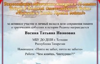 Педагоги Детской школы искусств Наталья Кудряшова и Татьяна Васина приняли участие во Всероссийском творческом конкурсе, посвященном 75-летию Победы в Великой Отечественной Войне «Память и Слава Героям войны!». На конкурс были представлены рисунки о войне, стихи, творческие работы. Наталья Кудряшова представила работу под названием: "А над головой, - мирное небо" (рисование песком). Татьяна Васина приняла участие в номинации: "Никто не забыт, ничто не забыто", представив рассказ о своих родственниках, прошедших войну. По итогам Всероссийского творческого конкурса, посвященного 75-летию Победы в Великой Отечественной Войне «Память и Слава Героям войны!» преподаватели отмечены Дипломами участников.