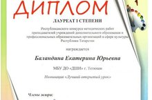В декабре преподаватели Детской школы искусств успешно приняли участие в Республиканском конкурсе методических работ среди преподавателей учреждений дополнительного образования и профессиональных образовательных организаций в сфере культуры Республики Татарстан, проводимом в г.Казань. Конкурс проходил в следующих номинациях: «Лучшая методическая разработка», «Лучший сценарий школьного мероприятия с элементами театрализации», «Лучшее переложение педагогического репертуара», «Лучший открытый урок», «Лучшая программа по обучению детей с ограниченными возможностями здоровья», «Лучшая авторская программа обучения». На Республиканский конкурс методических работ среди преподавателей учреждений дополнительного образования и профессиональных образовательных организаций поступило 94 работы со всего Татарстана: из Казани, Набережных Челнов, Азнакаево, Елабуги, Зеленодольска, Арска, Чистополя, Альметьевска, Кукмора и т.д.