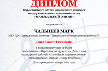 В январе 2019 года преподаватель ДШИ Гумерова Лиана Ренатовна с учеником первого класса по специальности «баян» Чалышевым Марком приняли участие во Всероссийском детско-юношеском конкурсе инструментального исполнительства «МУЗЫКАЛЬНЫЙ ОЛИМП».