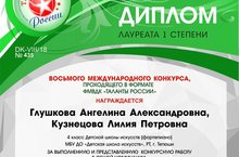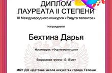 Учащиеся четвертого и пятого классов Детской школы искусств Бехтина Дарья, Потапова Полина, Глушкова Ангелина, Богян Маргарита под руководством Кузнецовой Лилии приняли участие в III Международном конкурсе «Радуга талантов», организованного при поддержке Центра творческого развития детей «Мозаика талантов» г.Москва.
