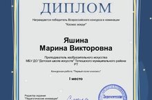 Преподаватель Детской школы искусств художественного отделения Яшина М.В. приняла участие во Всероссийском конкурсе: Гагаринский урок «Космос - это мы», посвященный Дню космонавтики. Задачи конкурса: содействие в повышении профессиональных компетенций педагогических работников, внедрение и распространение современных инновационных технологий в образовательные процессы и педагогическую деятельность, выявление и распространение педагогического опыта работы. По итогам конкурса в номинации: «Космос вокруг нас», с конкурсной работой: «Первый полет в космос» Яшина М.В. удостоена Диплома за 1 место. Поздравляем!