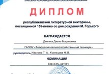 22 марта 2023 г. студентка 13 группы ГАПОУ «Тетюшский сельскохозяйственный техникум» Демина Диана приняла участие в Республиканской литературной викторине, посвященной 155-летию со дня рождения М.Горького, которая проходила на базе ГАПОУ «Лениногорский политехнический колледж». Она стала победителем в номинации «Верность автору». Подготовили участницу викторины преподаватели Иванова Т.А. и Кузнецова Н.В.