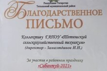 Коллективу ГАПОУ «Тетюшский сельскохозяйственный техникум» вручили Благодарственное письмо от Председателя оргкомитета, Руководителя Исполнительного комитета Тетюшского муниципального района А.Б.Семенычева за участие в районном празднике «Сабантуй-2021» с пожеланиями всем успехов, крепкого здоровья, счастья, мира и благополучия.