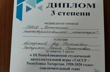 20 апреля 2021 г. на базе Казанского нефтехимического колледжа имени В.П. Лушникова проходила III Республиканская студенческая интеллектуальная игра «ТАССР – Республика Татарстан, 1920 – 2020 годы» (заключительный этап). В игре принимало участие 25 учебных заведений СПО. Команда нашего техникума в составе 12 группы Аяза Айтуганова и Ранила Зайнуллина заняли 3 место. Наши студенты 3-й год подряд становятся призерами этого престижного конкурса. Поздравляем с призовым местом в конкурсе!
