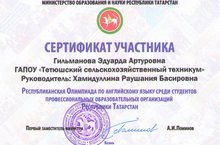 27 февраля студентка ГАПОУ «Тетюшский сельскохозяйственный техникум» Гильманова Эдуарда приняла участие в Республиканской Олимпиаде по английскому языку среди студентов профессиональных образовательных организаций РТ, которая прошла на базе ГАПОУ «Казанский радиомеханический колледж». В мероприятии приняли участие представители 51 учебного заведения республики. Олимпиада состояла из двух очных туров. По итогам I тура Эдуарда набрала более 35 баллов и успешно прошла во II тур.