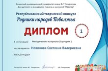Методист технического творчества Центра дополнительного образования Новикова С.В. приняла участие в Республиканском творческом конкурсе "Родники народов Поволжья" и заняла 1 место в номинации Методические материалы. Конкурс проходил с целью повышения интереса к изучению и сохранению традиций, обычаев и культурного наследия народов Поволжья проживающих в Республике Татарстан, патриотического и духовно-нравственного воспитания подрастающего поколения.