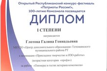 Глотова Г.Г, педагог Центра дополнительного образования, награждена Дипломом 1 степени Открытого Республиканского конкурса-фестиваля «Патриоты России!», посвященного 100-летию Комсомола, в номинации «Прикладное творчество и ИЗО-работы» (возрастная категория «профи»).