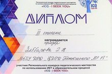 Зяббарова Э.Н. педагог МБОУ ДОД «Центр дополнительного образования детей», награждена дипломом 3 степени Регионального конкурса педагогического мастерства по использованию информационно-коммуникативных технологий в образовательном процессе «ISQ – I Seek You», финал которого прошел 3 марта 2018 года в г. Набережные Челны.