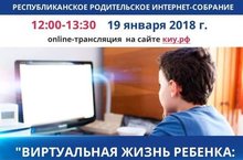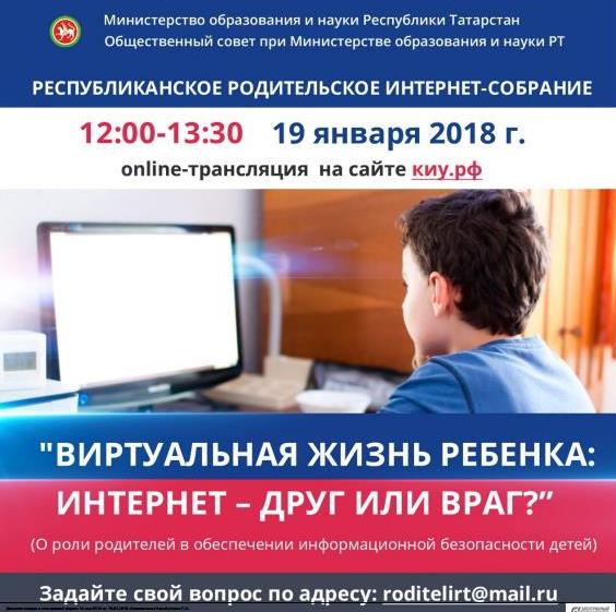 Во исполнении плана Министерства образования и науки РТ 19.01.2018 года с 12.00 до 13.00 состоится Республиканское интернет-собрание "Виртуальная жизнь ребенка: друг или враг?"