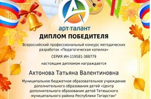 Дипломом победителя Всероссийского профессионального конкурса методических разработок «Педагогическая копилка», в номинации «Конспект учебного занятия в УДО», награждена педагог Центра дополнительного образования детей Тетюшского муниципального района РТ Ахтонова Татьяна Валентиновна, руководитель объединения «Природа в декоративно-прикладном творчестве».