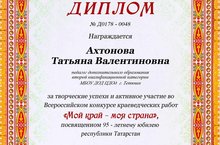 Дипломом за творческие успехи и активное участие во Всероссийском конкурсе краеведческих работ «Мой край – моя страна», посвященном 95-летнему юбилею Республики Татарстан, в номинации «Сценарий мероприятия», награждена педагог Центра дополнительного образования детей Тетюшского муниципального района РТ Ахтонова Татьяна Валентиновна.