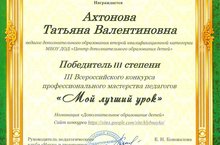Педагог дополнительного образования МБОУ ДОД «Центр дополнительного образования детей Тетюшского муниципального района РТ» Ахтонова Татьяна Валентиновна (объединение «Природа в декоративно-прикладном творчестве») стала победителем 3 степени III Всероссийского конкурса профессионального мастерства педагогов «Мой лучший урок» в номинации «Дополнительное образование детей».