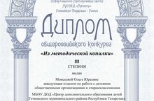 Дипломантом 3 степени общероссийского конкурса «Из методической копилки» в номинации «сценарии» стала Моисеева Ольга Юрьевна, заведующая отделом о работе с детскими общественными организациями и старшеклассниками Центра дополнительного образования детей.