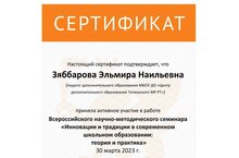 Педагог Центра дополнительного образования, Зяббарова Э.Н. приняла участие во Всероссийском научно-методическом семинаре «Инновации и традиции в современном школьном образовании: теория и практика», который проводился Елабужским институтом Казанского федерального университета. Доклад педагога по теме «Особенности организации воспитательной работы в вокальном объединении «Лунный кораблик», был опубликован в сборнике по итогам семинара.