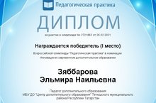 Педагог дополнительного образования МБУ ДО «ЦДО» Зяббарова Э.Н. стала победителем Всероссийской педагогической олимпиады «Педагогическая практика» в номинации «Инновации в дополнительном образовании».