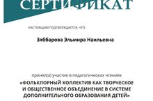Педагог дополнительного образования МБУ ДО «ЦДО» Зяббарова Э.Н. приняла участие в Республиканских педагогических чтениях «Фольклорный коллектив как творческое и общественное объединение в системе дополнительного образования детей». Эльмира Наильевна выступила перед педагогической общественностью республики с докладом на тему «Формирование личностных качеств обучающихся вокального объединения «Лунный кораблик» через изучение фольклора». Организаторами Педагогических чтений являлись «Институт развития образования Республики Татарстан», ФГБОУ ВО «Казанская государственная консерватория имени Н.Г.Жиганова», Татарстанское региональное отделение общероссийской общественной организации «Российский фольклорный союз». Цель проведения Педагогических чтений: распространение передового педагогического опыта в сфере этнокультурного музыкального образования и воспитания.