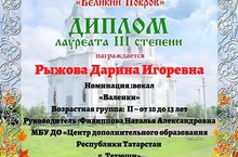 Участие в конкурсах и фестивалях одно из главных критериев, входящих в образовательную программу каждого педагога. Ежемесячно мы принимаем участие в них не только на муниципальном уровне, но и на уровне России. Рыжова Дарина - воспитанница вокального объединения "Радость" (педагог Филиппова Н. А.), приняла участие в Межрегиональном фестиваля-конкурсе народного творчества «Великий Покров», который проводился с 01 августа по 14 октября 2020 года в Курской области.