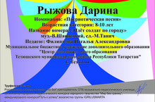Уку елы уңышлы башланды! "Шатлык" вокал берләшмәсендә тәрбияләнүче Рыжова Дарина "Уңышка юл" (Санкт-Петербург шәһәре) Халыкара читтән торып үткәрелгән балалар-яшүсмерләр иҗаты конкурсында катнашты һәм III дәрәҗә лауреат булды. Берләшмә җитәкчесе, Филиппова Наталья Александровна, конкурсны оештыручылардан Рәхмәт хаты белән бүләкләнде. Уңышлар һәм яңа җиңүләр телибез!