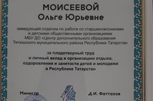 Благодарностью Министерства по делам молодежи РТ за плодотворный труд и личный вклад в организацию отдыха, оздоровления и занятости детей и молодежи в Республики Татарстан награждена Моисеева Ольга Юрьевна, заведующая отделом по работе с детскими общественными организациями и старшеклассниками МБУ ДО «Центр дополнительного образования Тетюшского муниципального района РТ»