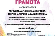 Обучающиеся объединения «Моя малая Родина» Горбунова Арина и Егоркина Ангелина (руководитель – Л.Н. Долгова) заняли 1 место на Межрегиональной научно-практической конференции «Россия – моя история»в секции «Культурное наследие».