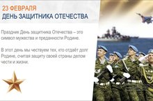 Сегодня разговоры о важном в 5а классе были посвящены празднику "День защитника Отечества". Говорили об истории Дня защитника Отечества, роли армии в защите страны, ее миротворческой миссии. Выполняя интерактивное задание, познакомились с современным вооружением российской армии – одной из сильнейших армий мира. Высказывали мнение о ценностях, которые характеризуют воинов русской, советской и российской армии, говорили об отличительных качествах русского солдата: любви к Отечеству, боевом духе, патриотизме, целеустремленности, стойкости, сплоченности, силе воли. Вспоминали героев, которые защищали Отечество на протяжении его многовековой истории. Говорили о военной науке, рассказывали об известных военных профессиях и профессиях будущего. В конце занятия обучающиеся пришли к выводу о важной роли Вооруженных сил Российской Федерации, которые обеспечивают безопасность государства и его граждан, защищают право народов России жить согласно историческим традициям и многовековым духовно-нравственным ценностям.