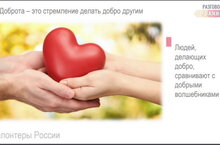 Внеурочное занятие "Разговоры о важном" в 5а классе сегодня было посвящено Волонтёрам. Цель занятия: формировать первоначальные представления у обучающихся, что такое добро, доброта, доброжелательность, добрые дела;