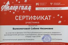 с 21.10.19 по 23.10.19 в г.Казани проходил XVII республиканский конкурс лидеров и руководителей детских и молодежных общественных объединений Республики Татарстан "Лидер года - 2019". МБОУ "Тетюшская СОШ №1 им.Ханжина П.С." представляла победитель муниципального этапа Валяхметова С. учащаяся 11 А класса. (рук-ль Лазарева Л.Н.)