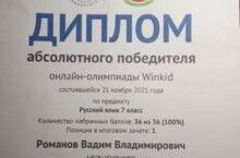 Поздравляем абсалютного победителя онлайн-олимпиады Winkid по предмету "Русский язык", ученика 7А класса Романова Вадима и учителя русского языка и литературы Петухову Надежду Петровну. Желааем дальнейших успехов!