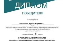 Поздравляем Михееву Ирину Юрьевну (учитель начальных классов ) с победой в Республиканском конкурсе «Лучшая программа внеурочной деятельности» в номинации «Духовно – нравственное направление».