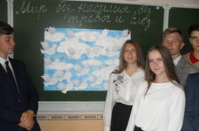 Урок мира в 9Б классе (классный руководитель Морозова Н.Г.) начался с истории этого праздника. Вспомнили, что раньше в России никогда не было единой даты начала учебного года. Только в 1935 году вышло постановление о единой дате начала учебы во всех школах. Официально День знаний был учрежден 1 октября 1980 года. В формате урока мира его впервые отметили только 1984 году, целью которого стало воспитание патриотизма, гордости за Родину и гражданственности. Почему же первый урок нового учебного года еще посвящен борьбе за мир? На этот вопрос ребята ответили единогласно: «Против войны нужно бороться, пока она не началась» Конечно же, нельзя было не вспомнить 1 сентября 2004 года. Северная Осетия, Беслан, захват школы. Угрозы, слезы, кровь… В конце урока ребята вырезали голубей. Эта птица является символом мира, символом борьбы против войны, насилия, тревог и слёз. На каждом голубе написали свое пожелание мира для всех людей нашей большой планеты. Пусть наши голуби всему миру расскажут о том, что дети в России и других странах не хотят войны.