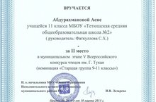 Подведены итоги муниципального тура V Всероссийских Тукаевских чтений.В старшей группе ученица нашей школы Абдурахманова Асия заняла второе место, награждена Грамотой Отдела образования Тетюшского муниципального района. Демидов Владимир, Джаббаров Шаир награждены грамотами за лучшее исполнение стихотворения на татарском языке. Остальные участники отмечены сертификатами.