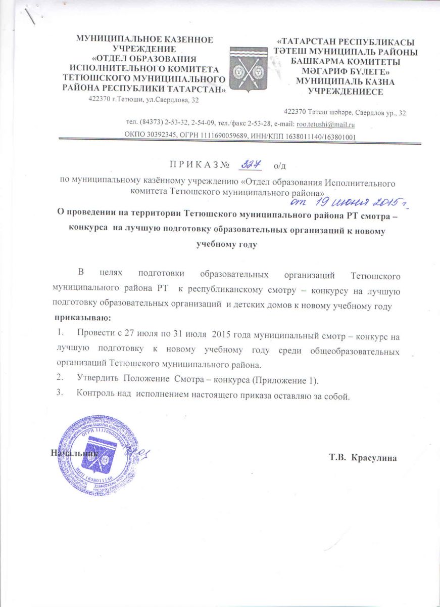 Приказ №539/1-од "О введении учебного курса "История Тетюш и Тетюшского края" от 04 сентября 2013 г.