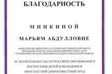 Педагогические работники Тетюшского государственного колледжа гражданской защиты Минкина Марьям Абдулловна и Арсланова Салима Салаховна награждены Благодарностью Депутата Государственной Думы Российской Федерации седьмого созыва, заместителя председателя Комитета по делам национальностей Гильмутдинова Ильдара Ирековича за значительные заслуги в образовании и воспитании молодого поколения и многолетний добросовестный труд в системе образования.