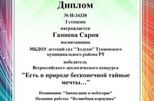 Наша юная воспитанница Ганиева Сария стала победителем Всероссийского экологического конкурса "Есть в природе бесконечной тайные мечты", номинация "Заповедник в моем крае". Они с папой изготовили замечательную кормушку, а воспитатель Миннеханова Айгуль Фаритовна помогла с участием в конкурсе. Спасибо всем! Дальнейших Вам творческих успехов!
