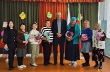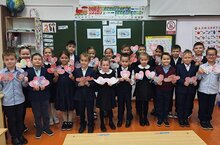 Сегодня учащиеся 5 класса вместе с Ахметзяновой Р.Г. поздравили С Днем Пожилых людей волонтеров, которые плетут маскировочные сети.