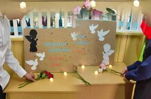 Сегодня в нашей школе состоялось важное мероприятие, посвящённое памяти жертв трагических событий в Беслане. В знак уважения и скорби был создан временный мемориал в фойе школы, посвящённый тем, кто погиб в результате террористического акта.
